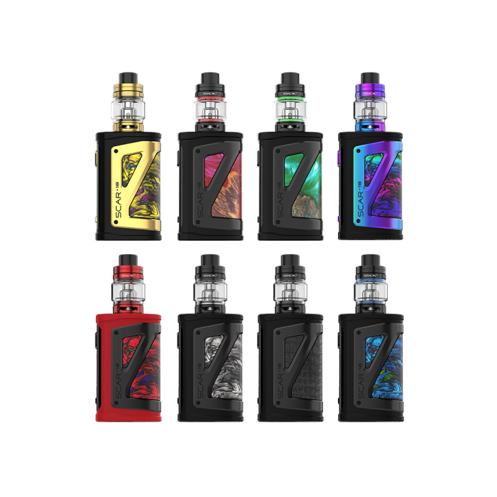 Das neue Scar 18 Kit von SMOK könnte garantiert dein neuer Alltagsbegleiter werden. Das Kit setzt sich zusammen aus dem Scar 18 Akkuträger und dem neu entwickelten TFV9 Tank. Die Haptik des Scar 18 Akkuträgers ist durch die Abgerundeten Kanten ausgezeichnet, außerdem ist der Scar 18 Mod gemäß Schutzklasse IP67 hergestellt. Das bedeutet der Scar 18 ist vor Wasser, Staub und Stößen geschützt. Außerdem wird der USB Anschluss des Scar 8 Akkuträgers durch eine Gummikappe geschützt. Betrieben wird das Scar 18 Kit mit zwei 18650er Akkuzellen welche ihm eine Leistung von bis zu 230 Watt geben. Obwohl der Scar 18 Akkuträger groß genug für zwei Akkuzellen ist, ist er immer noch ein Leichtgewicht. Mit einem Leergewicht von 183,5 Gramm bemerkt man ihm bei Transport kaum. Versehen mit dem neuen IQX-Chipset lassen sich folgende Modi einstellen: TC-Modus, VW-Modus, VPC-Modus und Bypass-Modus. Das 0,96 Zoll große OLED Display zeigt in Farbe die wichtigsten Parameter an. Der TFV9 Tank wurde extra für das Scar 18 Kit entwickelt. Sein Tank fasst 6,5 Milliliter. Das befüllen des Tanks erfolgt per Top-Fill-System, das macht den TFV9 Tank auslaufsicher. Der auf das DL-Dampfen ausgelegte Tank des Scar 18 lässt sich über die Bottom-Air-Flow-Control etwas individualisieren. Die für den Scar 18 entworfenen V9 Mesh-Coils sorgen für eine großartige Dampfbildung und einen wunderbaren Geschmack. Das SMOK Scar 18 Kit ist ein wahrer Alltags- und Outdoorheld.